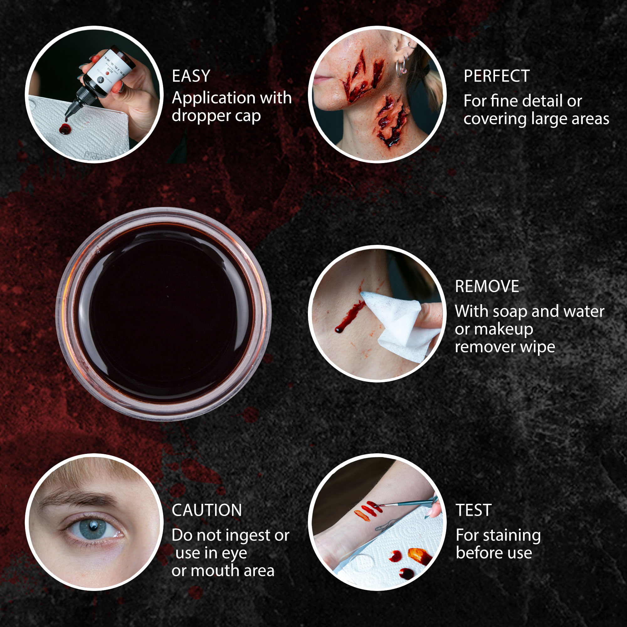 Directions: Shake well. Apply with bottle, brush, sponge or fingers. Remove the fake blood with soap and water or makeup remover wipe.