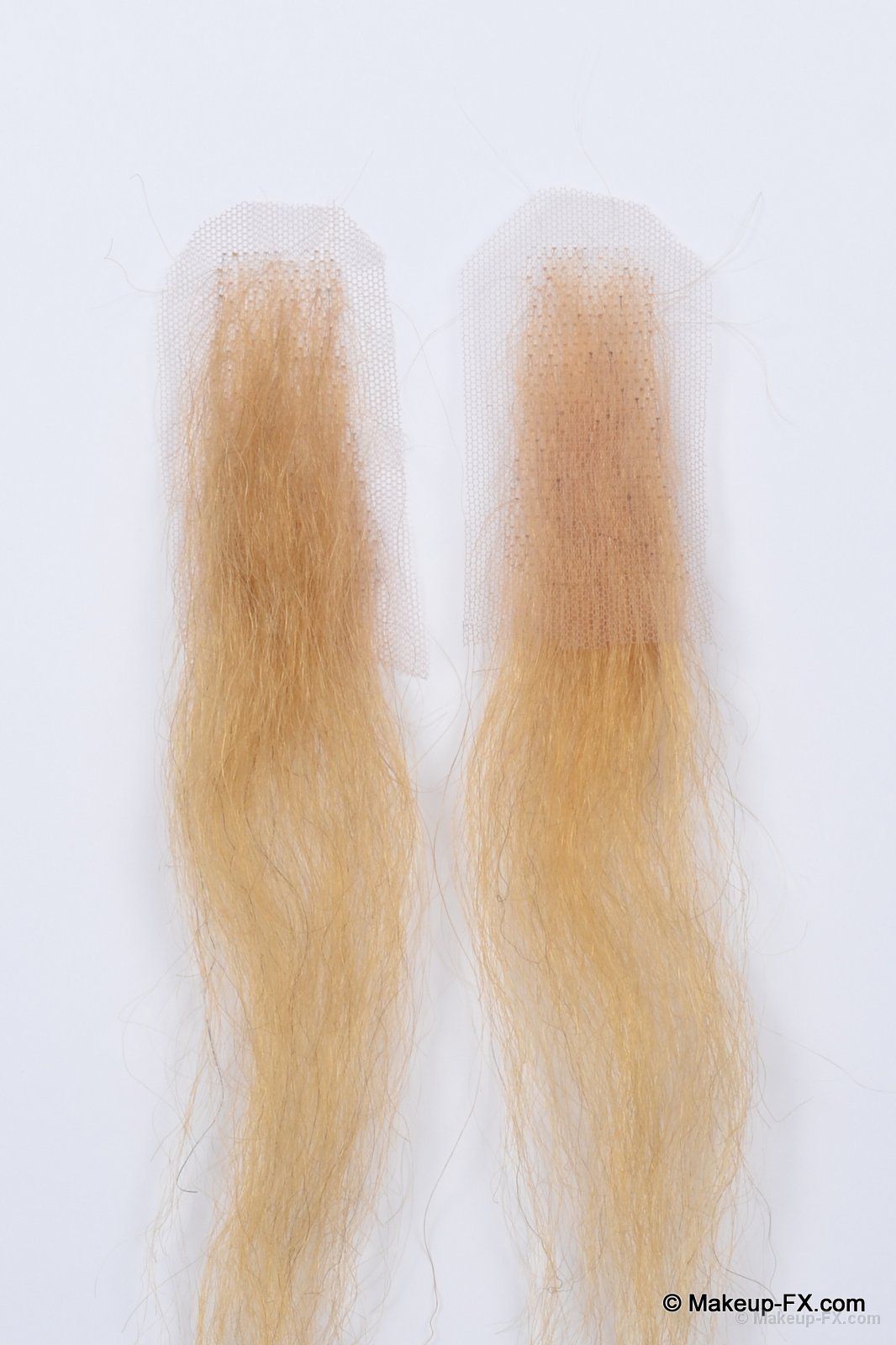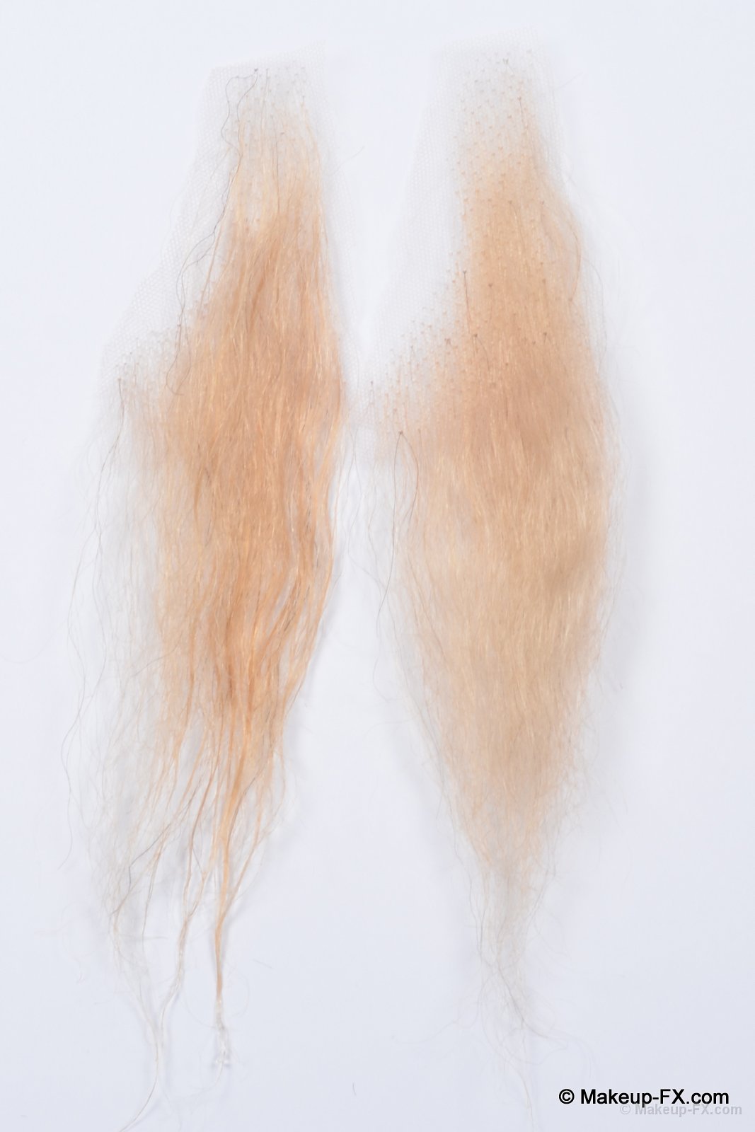 Handmade human hair lace beards for stage and screen. Colour: Blond Fischbach+Miller reference colours: 98% 217, 2% 223 Made from 20 cm/8" long human Asian hair on thin nylon lace. We sell them in two sizes. No. 1 is a straight smaller sideburn No. 2 is a larger L shaped sideburn.