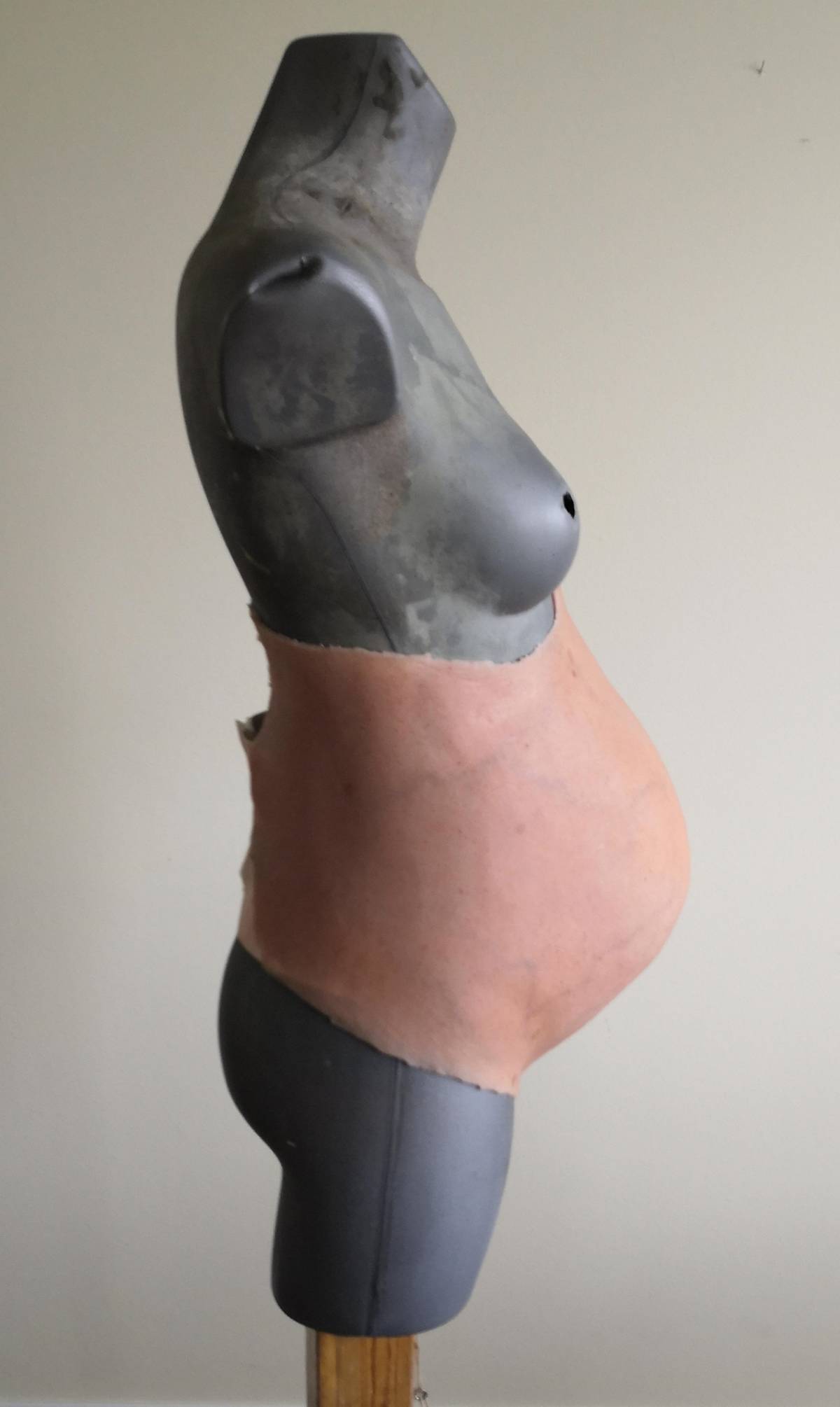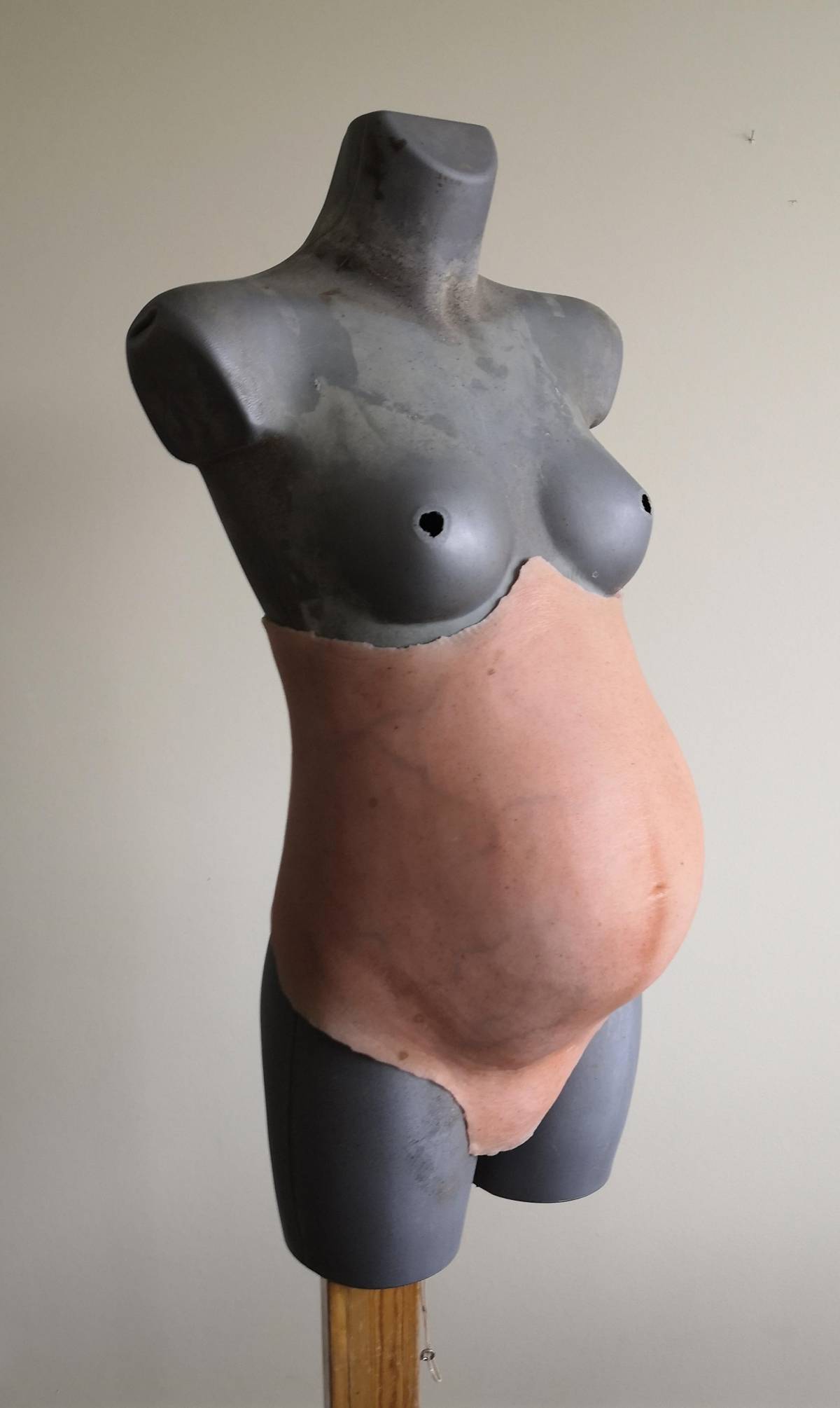 It is a nine months pregnant belly based on a cast of my wife and co-owner of the company Heather when she was pregnant with our son, Jack.
