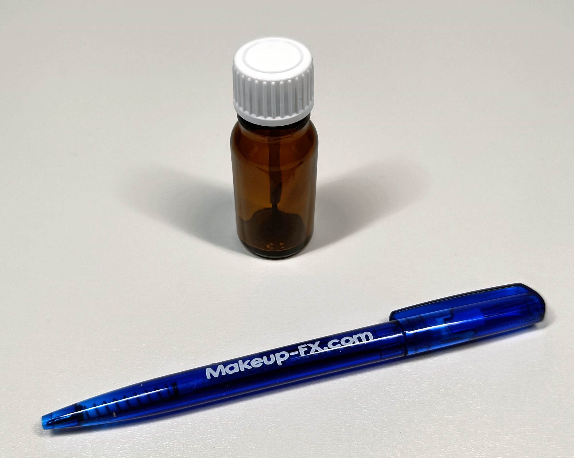 A small glass 10 ml / 0.34 oz bottle with a small brush that is suitable for most types of glue like Pros Aide or Telesis. The brush and lid are not compatible with acetone based glue or stipple. The pen is only a size reference.